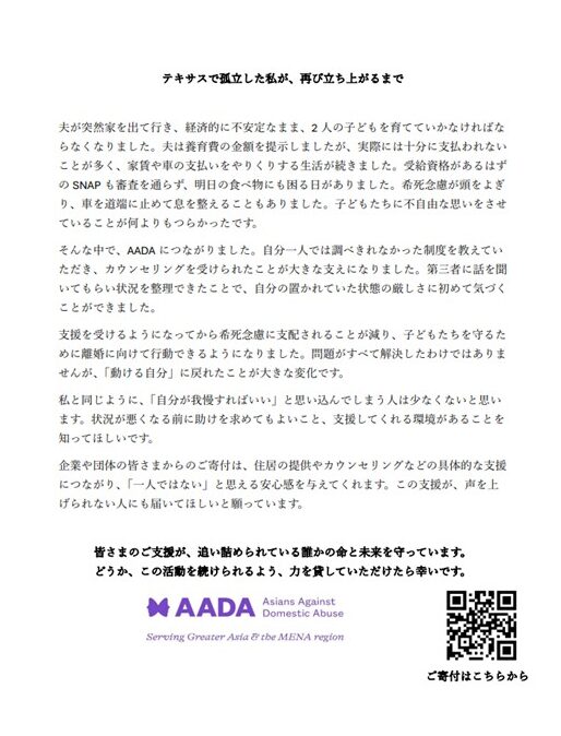 講演後に、Asians Against Domestic Abuse (AADA)からのお知らせがあります。家庭内モラハラとDVに関するウェビナーの資料はこちらです。皆様からのご寄付は有効に使われています(クライアントより)。