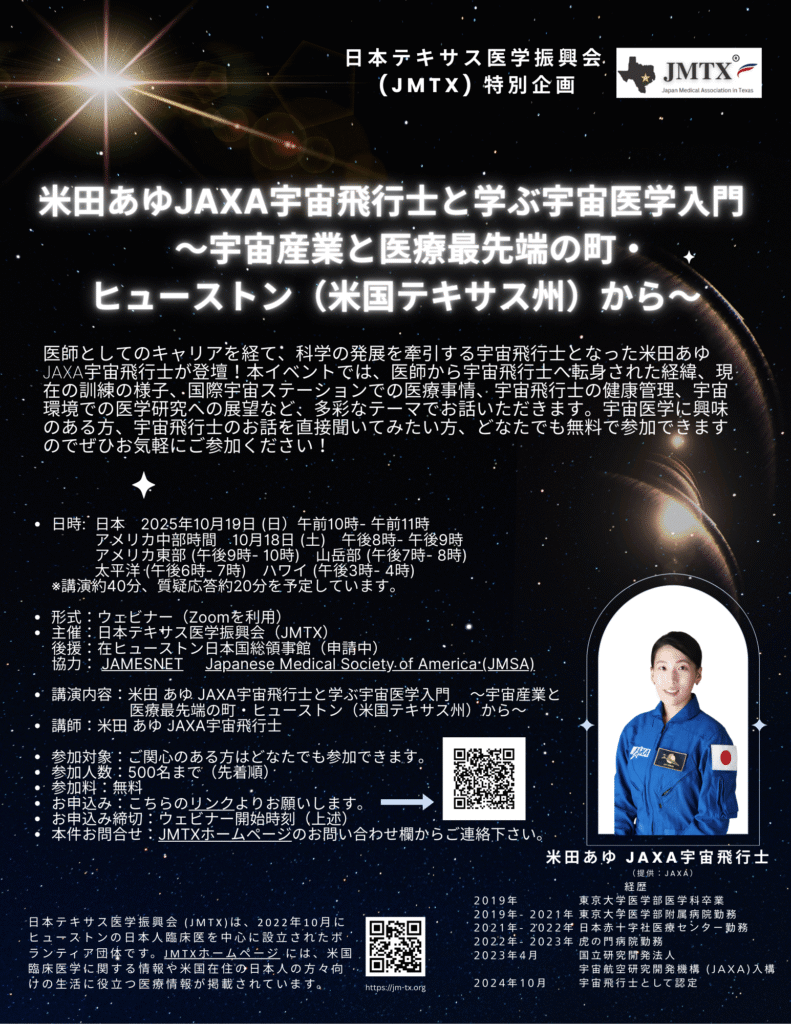 特別企画ウェビナー:米田あゆJAXA宇宙飛行士と学ぶ宇宙医学入門 ~宇宙産業と医療最先端の町・ヒューストン(米国テキサス州)から~ の開催報告レポートはこちらより